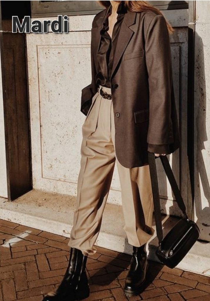 Mardi : Toujours en pantalon, c’est la saison, on n’a moins envie de porter des collants noirs (sauf si ils ne se voient pas, sous du long). Toujours en costume mais désassorti, veste chemise dans les même tons et pantalon clair (un 7/8 si le pantalon dans les boots est de trop), boots mastocs pour marcher dans les flaques.