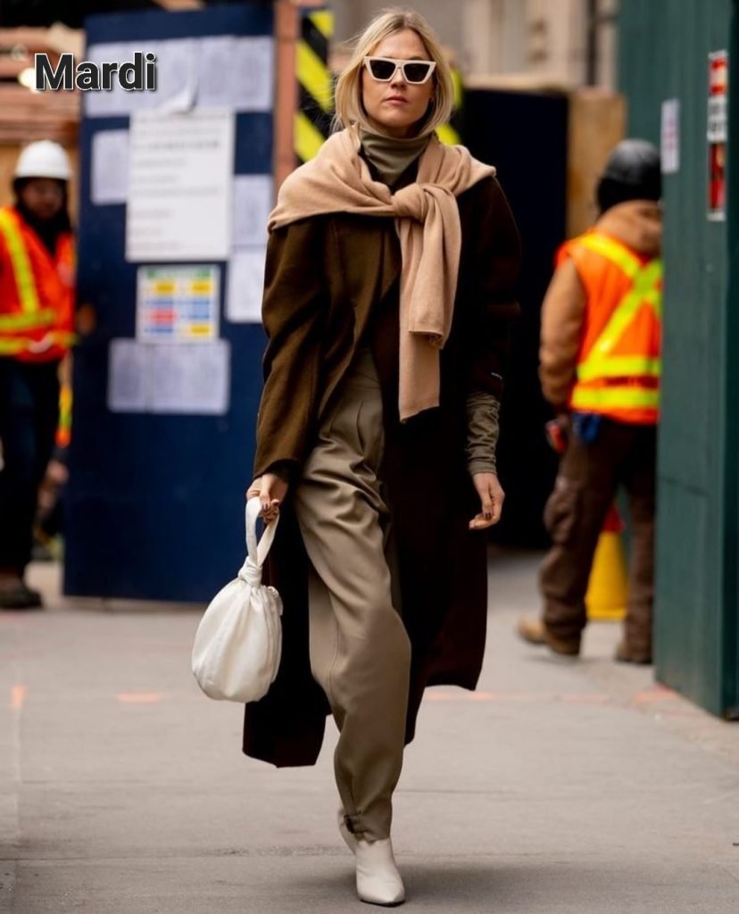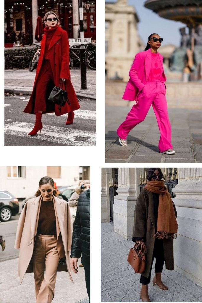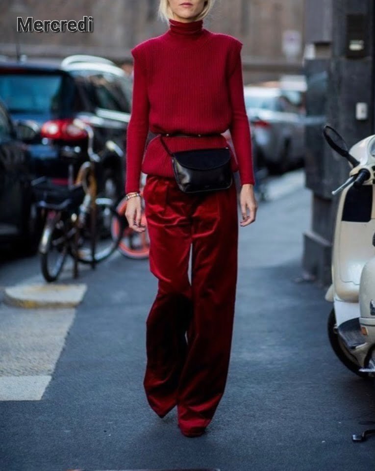 Même concept chromatique mais en pantalon, col roulé, manteau avec une accessoirisation qui tranche. Oui il est possible d’assortir son sac ET ses chaussures. C’est d’ailleurs ce qui renforce l’impact visuel de ce look. Le pull noué dans une teinte lumineuse est bien vu ici (oui je change d’avis comme de chemise, c’est précisément l’esprit de la mode, ça s’en va et ça revient c’est fait de tout petit rien)