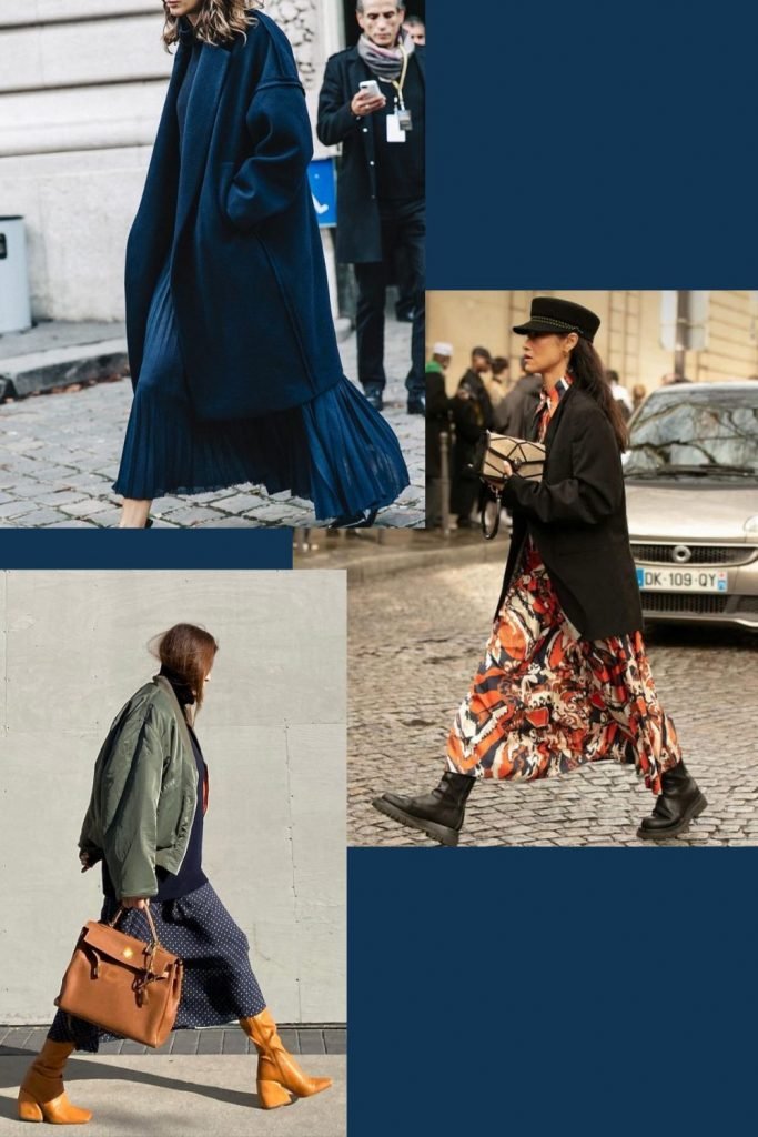 Une robe en maille douillette avec des godillots masculins et un manteau fitté – Lorsqu’on porte du long, le manteau 7/8 légèrement plus court est le plus souvent le mieux adapté.