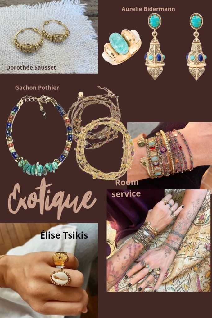 Les Exotiques, Les ethniques : Evoquent des voyages lointains d’où généralement on les rapporte. Attention toutefois à l’engouement sur place qui se transforme en déception une fois rentrée. N’achetez que ce qui est dans « votre » ADN. Ce n’est pas en achetant des bijoux à Marrakech que vous rentrerez en Loulou de la Falaise. Selon votre style, ils se portent à l’année ou plutôt l’été – pour ma part plutôt l’été et avec des looks à la saveur bohème – mais ils fonctionnent très bien aussi avec une dégaine à l’aura rock, surtout lorsqu’il s’agit de turquoise sertie sur de l’argent. On n’oublie pas le ceinturon bijoux qui marque immédiatement le territoire dans lequel le look s’inscrit. Encore ici, l’accumulation est la bienvenue.