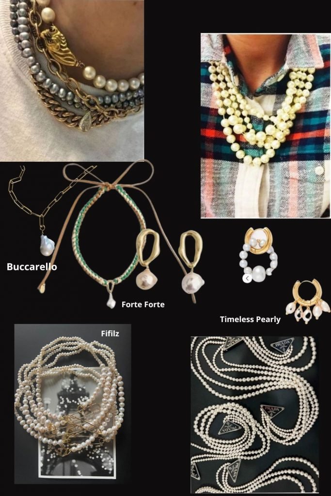Les Perles : J’en ai parlé l’autre jour, les perles ont de nouveaux la cote. Si on les as pas mal vu en mode boucles d’oreilles minimalistes ces dernières saisons, cette année c’est en rang qu’elles se déclinent. En composition de notre choix, le simple collier de perle de mémé fera l’affaire mais si vous préférez le porter seule, une petite customisation sera quand même nécessaire surtout si on a la tête de l’emploi (une tête de quincaille quoi), genre un nœud de tissu ou tout autre artifice qui le rendra plus 2023 compatible.