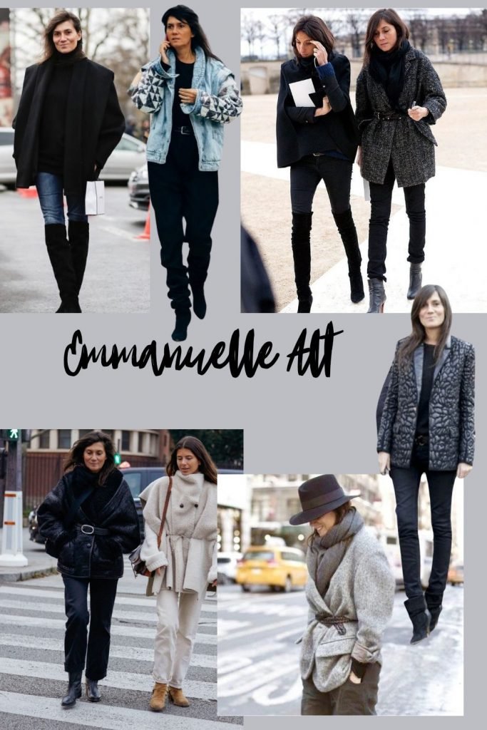 Autre styliste, amie ou ennemie ou plutôt amie puis ennemie, Emmanuelle a depuis toujours cultivé son côté rock-folk – Silhouette élancée (elle a été un petit temps, mannequin), jambes fines, elles quittent rarement ses slims qui sont aujourd’hui un peu moins fittés qu’avant. Boots à talons, veste de tailleur (en bonne fan de Michael Jackson, elle a porté avec adoration les collections de Decarmin chez Balmain qui rendait hommage au king of pop). Son truc à elle, ceinturer à peu près toutes ses vestes, manteaux, kimonos, sherling. Beaucoup de Isabel Marant, normal c’est elle qui est à l’origine du succès de la marque. A l’époque Isabel faisait plus dans l’ethnique, Emmanuelle a apporté l’influence rock sexyness lorsqu’elle est devenue sa conseillère artistique, qui est depuis la marque de fabrique d’IM. Assurément le style le plus répandu chez les parisiennes qui n’en font jamais trop mais ont toujours une pièce iconique d’une marque quelconque.