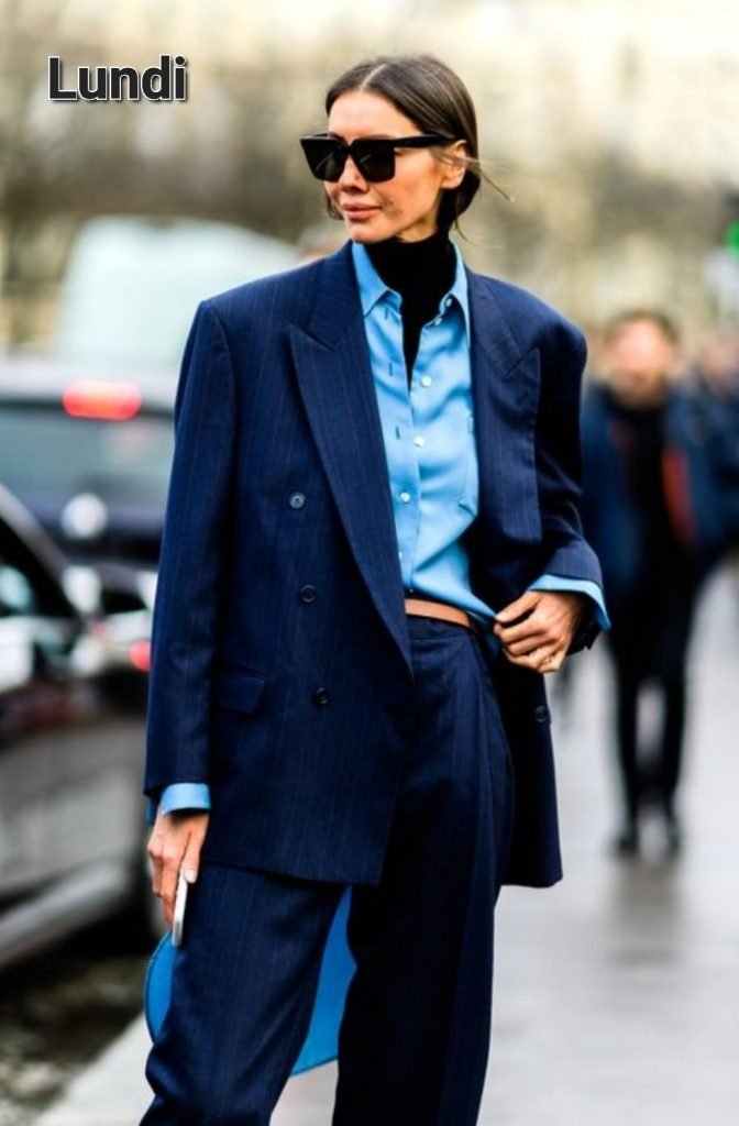 Démarrons la semaine studieusement avec un costard classique, de celui que l’on peut typiquement trouver au rayon homme d’une boutique vintage, assorti d’une chemise classique elle aussi et d’un col roulé fin en dessous pour la touche hiver 2023. On enfile un grand manteau par dessus et on chausse, des tennis, des pompes masculines ou des boots pointues.