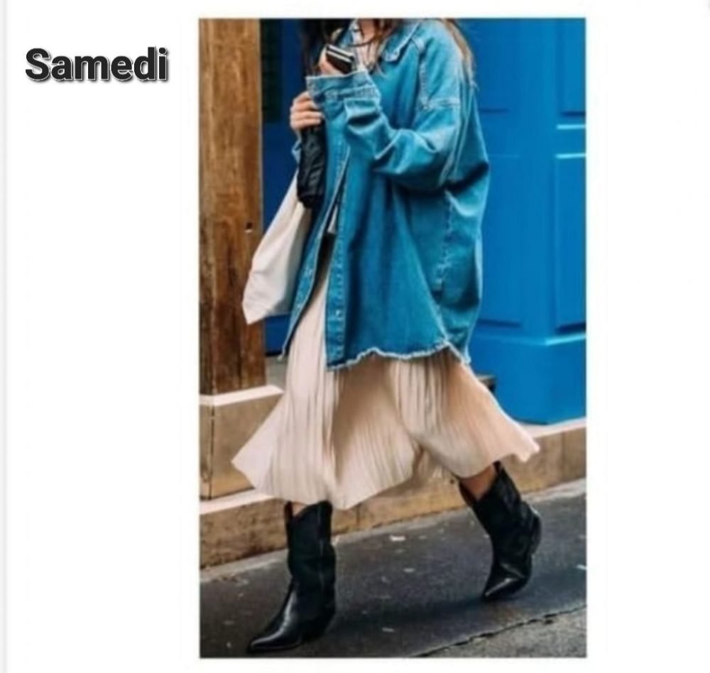 Samedi, on ressort la petite jupe plissée qu’on acoquine avec des tiags ou des bikers et une chemise oversize (avec une petite maille en dessous histoire de pas se geler) – ici en jean mais elle peut être, à carreaux, en velours, en laine bouillie, celle de votre homme + votre manteau évidemment –