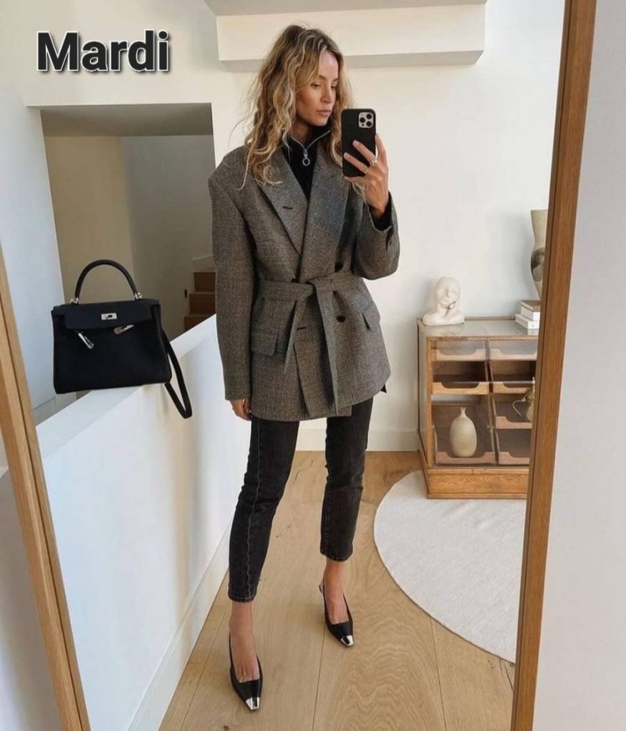 Mardi, un pull camionneur sous une veste ceinturée avec notre vieux slim mais noir ou gris, plus smart pour le taf – parce que la veste ceinturée ne fonctionne pas vraiment avec autre chose, j’ai essayé avec un pantalon de costard et sur moi c’était bof. On troque les escarpins, pas encore de saison contre une paire de boots galbant la cheville et on enfile un truc par dessus, veste / caban oversize ou manteau, comme d’hab quoi. L’intérêt des vêtements d’extérieurs oversize, c’est justement de pouvoir varier les plaisirs de la tenue du dessous, en portant des vestes en guise de pull par exemple.