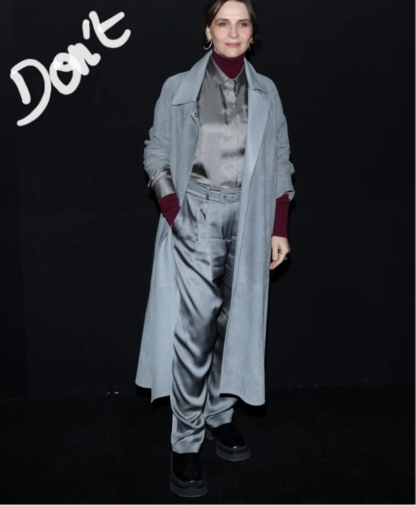 Houlalalalala quelle catastrophe. Que s’est-il passé Juliette ? Rien ne va ! Le maquillage assorti au sous-pull, le teint blafard que ce gris souris ne fait qu’accentuer. Cet ensemble tout mou satiné qui ne met pas en valeur ta silhouette. Le satin, jamais en total look sauf si c’est une slipping-dress. Et les chaussures ? On en parle des chaussures ? Non vaut mieux pas. Allez va te recoucher ça ira mieux demain.