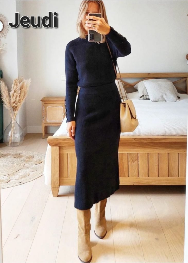 Le jeudi, un ensemble en maille comme ici (Sézane) ou une robe avec des bottes cool – type cavalières ou à petit talon – pas un truc qui emmène ce look dans une tenue sexy quoi – Par dessus, absolument tout ce que vous voulez, un gros blouson, un caban, un manteau, une veste en peau lainée, une doudoune ceinturée…..