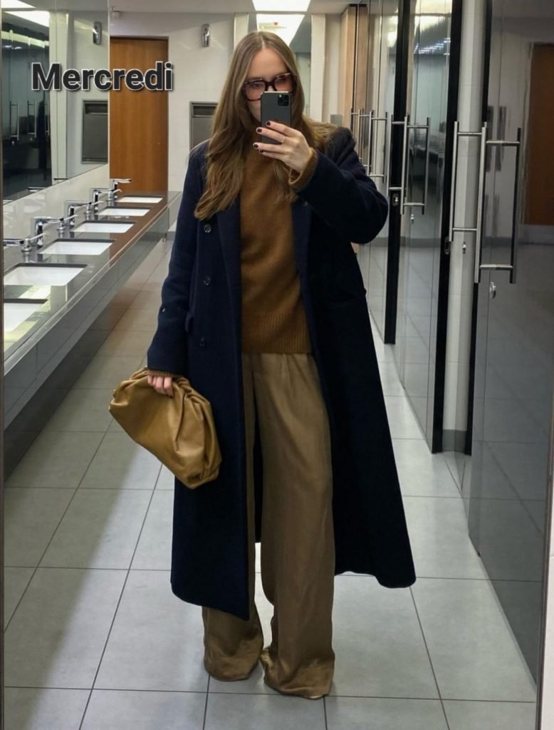 Le mercredi, le fameux pantalon large de la saison, associé à un pull dans les mêmes tons et un manteau qui tranche. La pochette est en option – tellement jolie mais tellement pas pratique – on la remplace par un sac dans les tons de la tenue du dessous. Les chaussures ? Où ça des chaussures ? ah ah – le bas du pantalon recouvre la chaussure sans traîner par terre comme ici évidemment. Pour autant, réservez ces futes uniquement pour les jours sans averses.