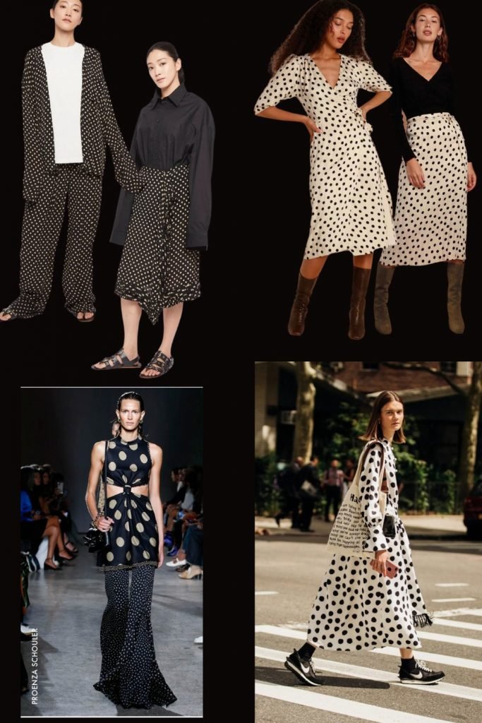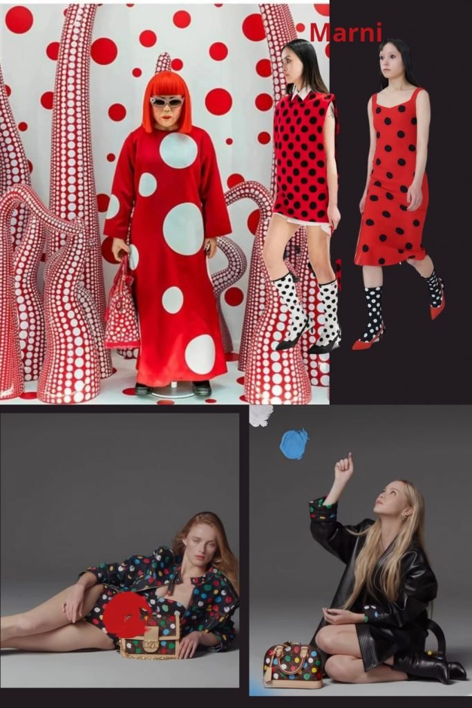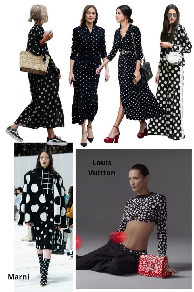 Yayoi Kusama, grande prêtresse des pois devant l’éternel fait des émules. Sa dernière collab avec Vuitton démocratise le pois dans sa version conceptuelle alors qu’on avait plutôt l’habitude de le voir en version rétro, années 40’s – c’était même devenu l’image de la parisienne dans l’imaginaire collectif – robe chemisier midi, petit col Claudine, plateformes (celles de l’occupation, lorsque le cuir était remplacé par le bois ou la corde pour cause de pénurie), ceinture fine, béret – réinterprétée par Claudie Pierlot dans les années 90 ou par Rouje aujourd’hui. Alors, nostalgique ou avant-gardiste ?