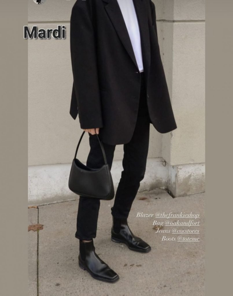 Mardi, total look noir illuminé par un tee-shirt blanc – Notre vieux slim, veste oversize pour pouvoir glisser un gilet dessous, des boots masculines mais tendances (motardes courtes, chelsea boots, tiags courtes) et un petit sac – on réchauffe tout ça avec une grosse écharpe.