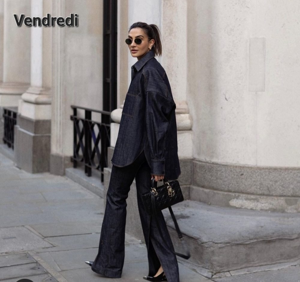 Ce vendredi c’est toujours le jean mais pas en mode friday wear. Total look jean brut, pantalon flare et longue chemise. De longues chemises oversize en jean, on risque d’en trouver partout au printemps car c’est une tendance forte. Je ne sais pas d’où vient cet ensemble mais je le trouve superbe, très couture – c’est sans doute un Dior d’ailleurs – Alors on s’inspire de ça. Et qui dit fute ras du bitume, dit obligatoirement bout qui pointe (oui cette phrase est bizarre). Si ce ne sont pas des escarpins, ce sera des boots.