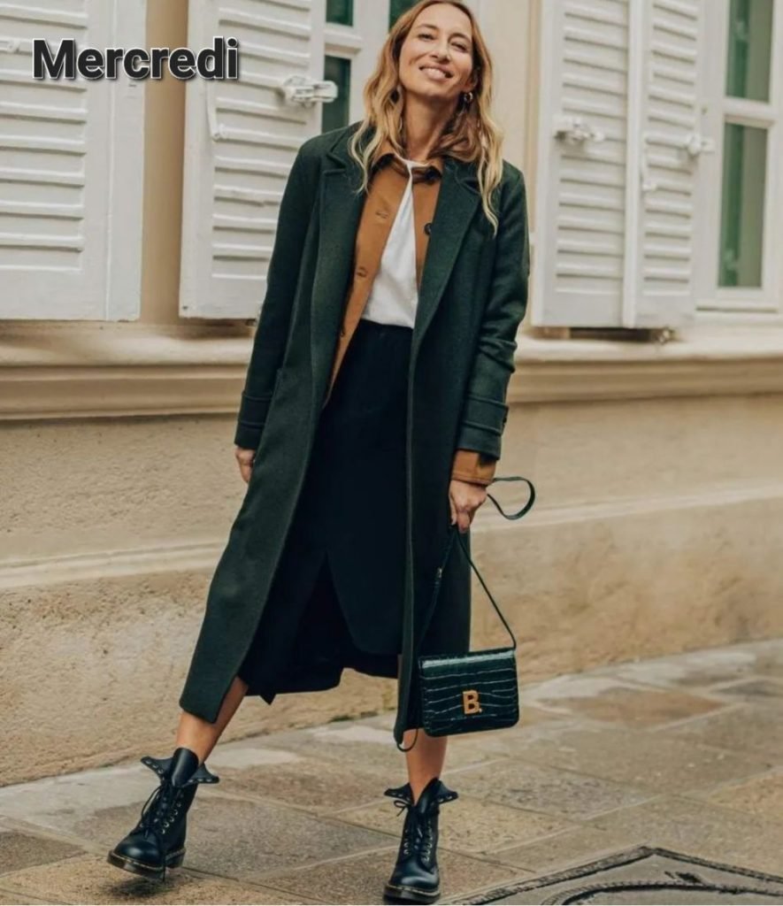 Le mercredi on enfile une jupe portefeuille, un kilt, un truc un peu conceptuel, faites avec ce que vous avez, le tee-shirt du mardi (je suis cracra hein), une petite veste de travail comme on est trouve dans les friperies, souvent en indigo (ou chez Carhartt) et un petit manteau pardessus très British, du coup qui dit british dit Doc Martens, le tout saupoudré d’un trait de luxe SVP (le sac), celui de votre grand-mère fera l’affaire. Rebelle mais pas tant que ça quand même !