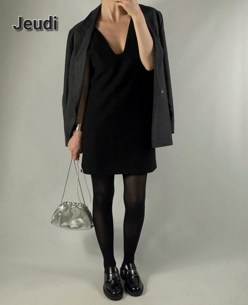 Le jeudi, « oh là tu t’emballes Ginette, tu vas où comme ça ? Au taf ? » « Bah y’a une vie après le taf quand même non ? » Donc pour changer un petit look pour soirée sage. La petite robe noire, sexy mais sans en faire trop, portée avec collant opaque (ça fait toute la différence) et des mocassins un peu lourds, un grand blazer par dessus et un petit sac funky pour finir. La tenue idéale pour passer de la soirée taf au vernissage, du dîner copines à la party time soft.