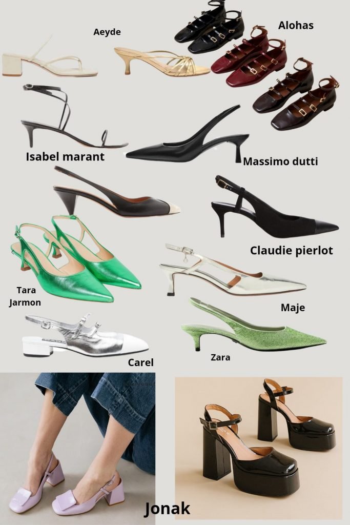 Commençons par les robes de cérémonies ou pour une occasion particulière, je sais très bien que lorsqu’un évènement de type cérémonie se profile, le « qu’est-ce que je vais me mettre » vous titille plus que de raison, du coup c’est bien d’anticiper pour avoir le temps d’aller essayer en boutique pour connaître sa taille dans les différentes marques, puis d’aller fouiner vers les sites de seconde main. Les magasins vintage regorgent eux aussi de pépites au rayon robes, ainsi que d’accessoires de caractères (ceintures / sacs du soir). Allez lorgner aussi du côté des outlet, inutile de craquer pour la robe de la saison d’une marque X ou Y au risque de se retrouver avec une convive qui aura la même (la boulette). Et puis surtout optez pour une robe que vous remettrez. Pas de blanc pour les mariages, le noir est aujourd’hui toléré même si pas ouf, ni de truc trop sexy ou wahouuuu, ce n’est pas VOTRE jour mais celui de la mariée. En revanche si c’est votre anniv allez-y à fond. Une robe longue sera toujours moins guindée portée avec de jolies sandales plates. De plus vos pieds vous remercieront (sandales bijoux pour plus de raffinement), les robes midi s’accomoderont, elles, très bien avec des plateformes. Les petites chaussures dadames légèrement rétro, aux talons carrés calmeront les petites robes près du corps. Il est préférable d’éviter les talons aiguilles, parce que qui dit évènement aux beaux jours dit souvent « pelouse ». J’ai quand même refait une petite sélection de slingback pour Anne-So qui me l’a demandé 🙂 (passez commandes Mesdames !).
