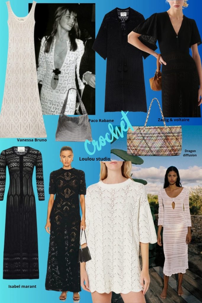 Autre tendance forte de la saison, qu’on avait déjà vu l’année dernière, le crochet. Portée avec une sous-robe coupée courte afin de jouer sur les transparences sans provocation, elle passera partout sans problème, en noire, crème ou blanche. Attention à la dentelle de coton trop épaisse qui risque de rester au placard pour les raisons évoquées plus haut. Sandales plates obligatoires, n’est pas Loana qui veut 🙂