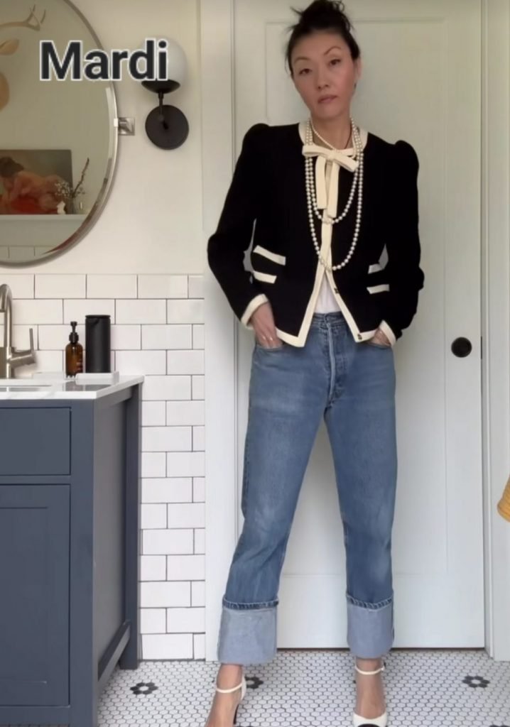 Mardi, chic chic, notre bon vieux jean, ni large ni moulant, reboulé d’un large revers contrasté par une veste ou un cardigan chanelisant (e) (à chiner au rayon vieilles dames) + collier de perles et toute la panoplie ainsi que de jolis souliers très bien comme il faut.