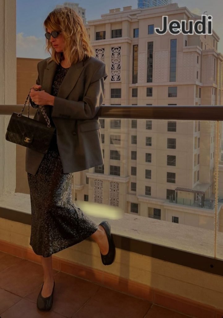 Une robe souple. Ici elle est à sequins, apparemment, mais une robe en jersey ou en maille fera le même effet. Portée tout simplement avec un blazer et des ballerines. C’est cool, féminin, pratique, what else ?