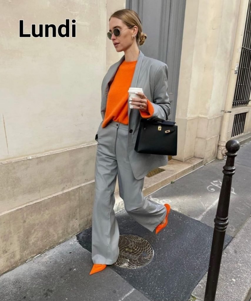 Lundi, un costume + une couleur très lumineuse, voire phosphorescente pour bien commencer la semaine. Idéalement on assortit le pull et les shoes.