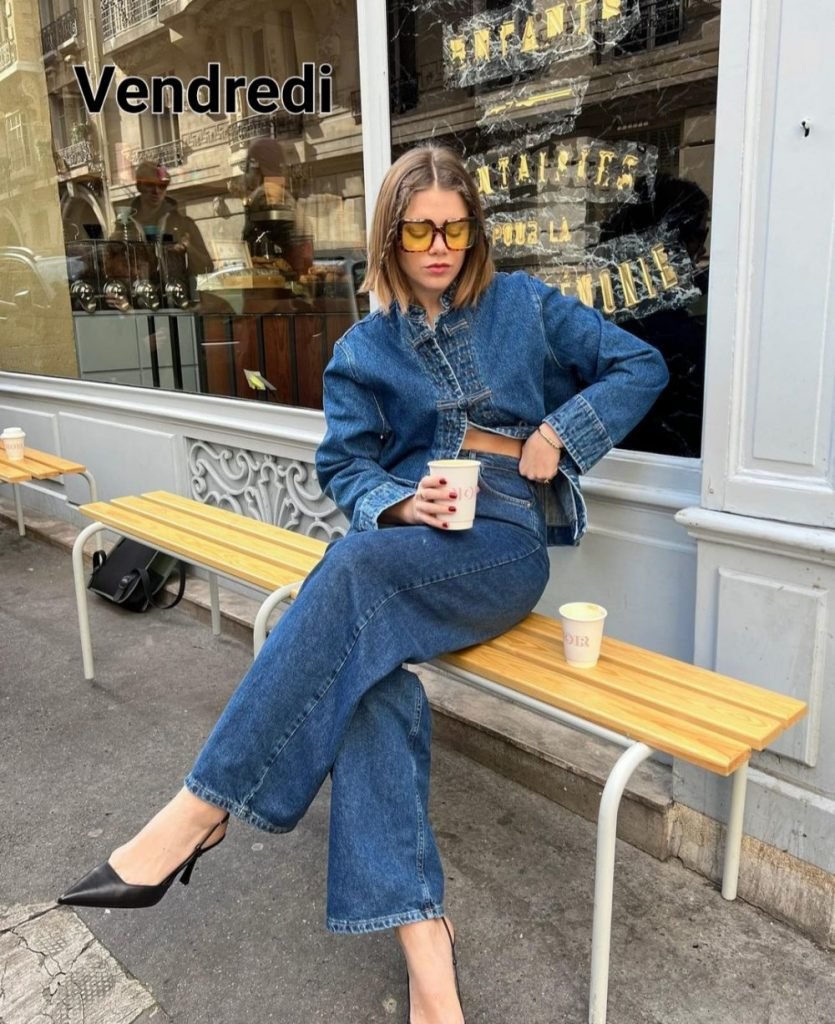 Vendredi, un total look jean sage mais pas chiant avec un jean droit et une petite veste de travail ou japonisante comme ici (Soeur) et des slingback pour féminiser l’ensemble.