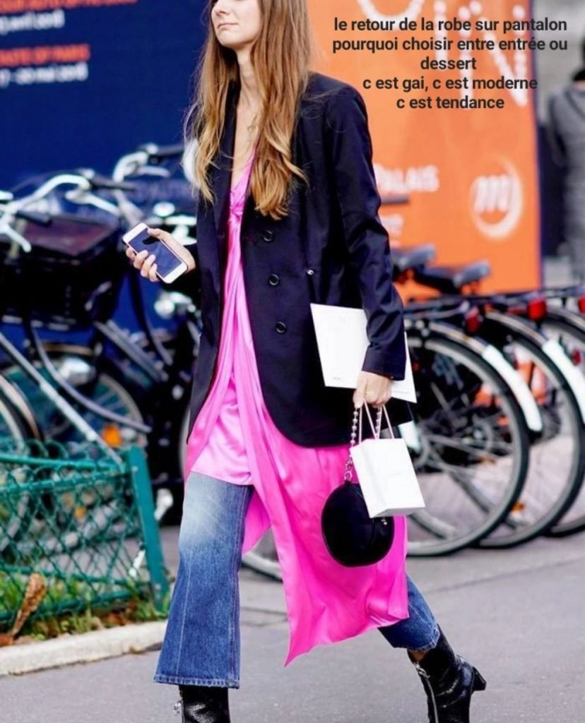 Sur les podiums pour l’hiver prochain, il y avait beaucoup de robes ou jupes sur pantalons. Lorsqu’il s’agit du luxe, on ne sait jamais trop si la démarche est honnêtement créative ou cyniquement mercantile – pour séduire une clientèle « cultuellement » plus couverte – Moi, ça me rappelle surtout les années 2000. J’ai beaucoup porté de robes très féminines en mousseline déstructurées sur des jeans flare. J’aimais beaucoup. Je ne sais pas si je refais ça mais je trouve cette tenue bien joyeuse.