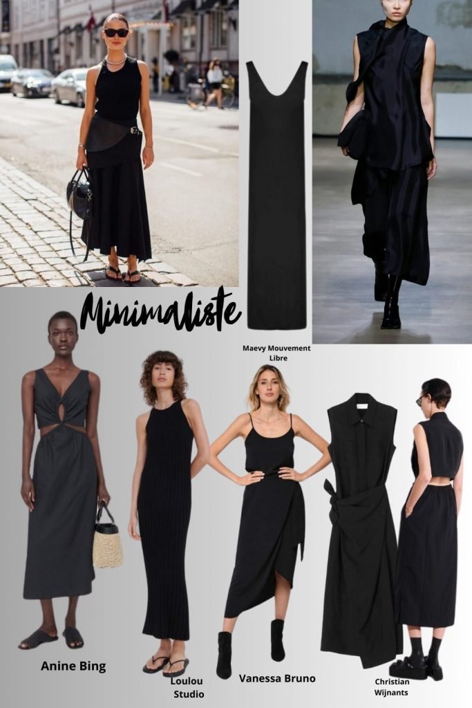 La robe minimaliste est sans doute la robe la plus tendance de l’été. Elle est unie (pas forcément noire), en coton côtelé, à bretelles, paréo, à découpes (j’avais dit que je n’en mettais pas mais celles-ci sont soft) et allonge la silhouette. L’avantage, si on ne veut pas les porter telles quelles, est que l’on peut leur associer une petite veste légère, une ample chemise courte que l’on laisse ouverte, un petit cardigan en crochet, une longue chemise, bref elles offrent plein de possibilités. Sandales, mules, claquettes, semelles épaisses tout leur va.