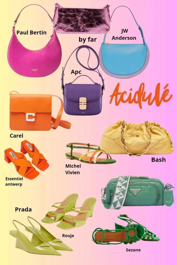 Quoi de mieux que des accessoires acidulés pour donner le LA de la saison ? Vous pouvez rester en jean et tee-shirt par ailleurs que cela sera parfait. Les mules à petits talons ont toujours la cote mais les compensées prennent la tête du peloton des tendances cette année. Les sandales jouent la sophistication en proposant des 5 à 7 croustillants (je parle des talons). Les petits sacs se parent de toute la gamme Pantone pour émoustiller nos papilles. Le sac baguette a toujours la préférence des Y2K. N’oubliez pas le seconde main pour ce type de pièce surtout si vous ambitionnez une « marque » – les prix s’envolent eux aussi en seconde main mais la négo est toujours possible –
