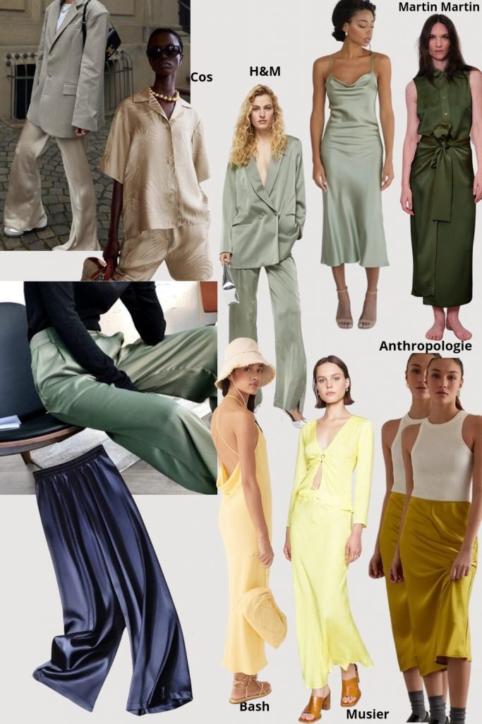 C’est vraiment l’année du body sculpt en fait, le satin revient lui aussi à fond. En slip skirt ou dress depuis quelques saisons mais en pantalon, ensemble pantalon ça faisait longtemps qu’il n’était pas réapparu. Encore un truc des années 90-2000. Alors pour en avoir eu, c’est fragile, ça marque de fou, d’où le body sculpt ET c’est overdressed. On peut toutefois calmer le jeu en associant une jupe ou un pantalon à un marcel en coton, une robe avec des sandales plates ou encore un costume avec des tennis. Après c’est un euphémisme que de dire que c’est chatoyant, peut-être même un peu trop, alors il est sans doute préférable d’opter pour une couleur chaude.