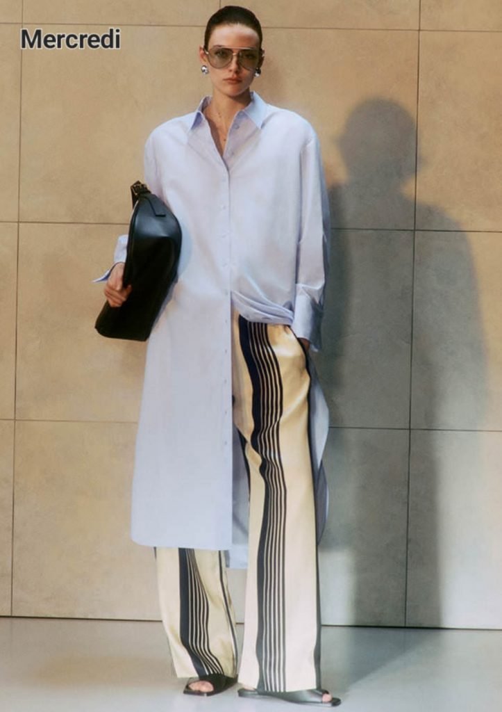 Mercredi, si la robe sur pantalon vous parait olé olé, essayez la robe chemise longue sur pantalon, plus easy. Le pantalon doit être souple et large et contraster avec la longue chemise, sinon gare à l’effet pyjama d’hosto. On remplace les sandales open toes par des moca mules et on attrape un cabas en cuir minimaliste. L’ensemble doit être net et inspirer l’intello qui sommeille en vous et non la babosse en partance pour Bibiza hein. Les grosses solaires dédaigneuses vont vous y aidez.