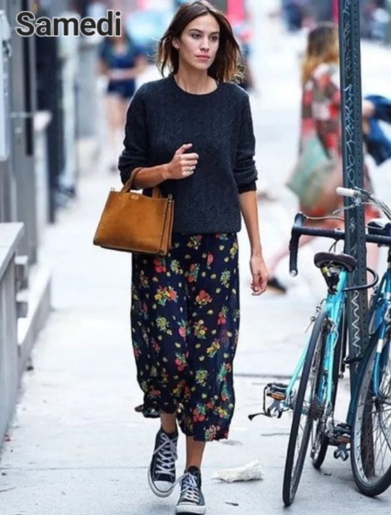 Samedi, une jupe ou une robe en viscose imprimée qui accompagne les courbes du corps sans les mouler que l’on porte avec une maille tout simplement. Tennis ou baskets simples + petit cabas pour faire ses courses.