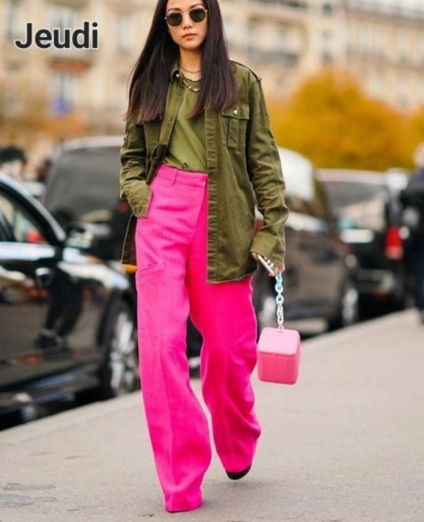 Un shot de couleur pour égayer la semaine avec un beau pantalon de couleur vive associé à un truc militaire, type chemise ou veste, ouverte sur un tee-shirt de même couleur ou de la couleur du pantalon. Sac féminin pour adoucir l’esprit militaire.