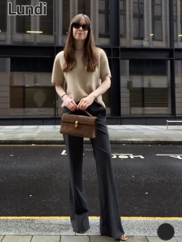 Lundi sur son 31. Le pantalon de costume flare est de nouveau un must have (fitté sur la jambe et s’évasant sur le bas, rasant le bitume). Archi féminin. À porter avec talon (boots, sandales ou slingback/escarpins). La saison est idéale pour enfiler des petites mailles à manches courtes (il est toujours possible de glisser dessous un sous vêtements en cachemire légèrement transparent dans la même teinte que le pull – y’a ça chez Intimissimi). C’est également la saison du trench alors par dessus bah…un trench – + joli sac chic.