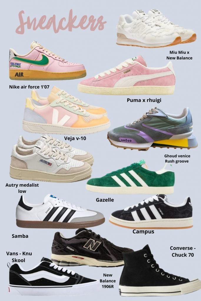 Pour finir ce focus accessoires, cap sur les sneakers tendances de la saison. A cette période, ce sont nos meilleures alliées pour accompagner nos futes, nos robes et autres puisqu’il ne fait pas encore assez chaud pour sortir les orteils à l’air. De plus c’est aussi la période des petites vacances, des longs week-ends où il est nécessaire d’être bien chaussées pour arpenter nos lieux de villégiatures. Je ne suis pas experte en la matière, ni une dingue de ça, je me contente de choisir une paire de temps à autre dans l’air du temps. J’ai toujours une paire de Stan Smith en cuir glacé à scratch, des Balenciaga, des Americana, des Autry montantes blanches et les dernières en date, des Samba beige. Je les choisis toujours de couleur neutre afin qu’elles aillent avec tout. Je me suis renseignée et la tendance lourde du moment, outre les 150 modèles et 25 collabs qui sortent chaque mois, c’est de porter une paire de sneakers noires.