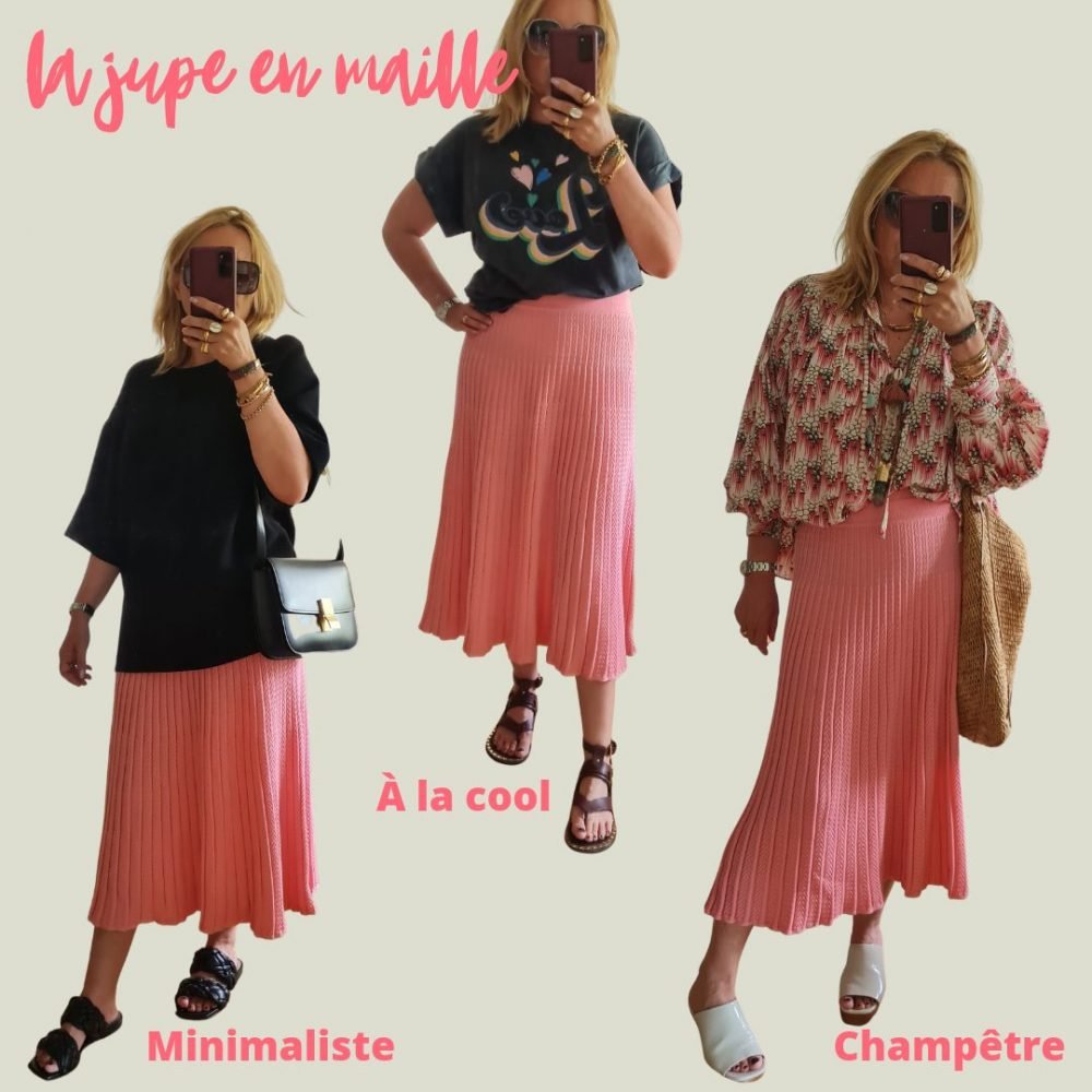 Pour celles qui ne seraient pas encore au courant, Molli est en train de cartonner en ce moment. Vous savez, c’est cette marque de layette qui faisait craquer les mamans. Rachetée par Charlotte de Fayet il y a quelques années, la maison lance une ligne femme et commence son ascension doucement, mais sûrement, vers le Mont Fashionista, celui là même où quand t’es là haut, toutes les minettes veulent un morceau de toi, où tu ne gères plus tes stocks qui sont souvent sold out, vous voyez le genre quoi. Blague à part, c’est d’une qualité irréprochable (made in France et Italie), complètement addictif et surtout tellement confortable. Autre point non négligeable, c’est totalement versatile. Ici en mode été : Champêtre avec une blouse bohème, un panier, des sabots – Tranquille, juste avec un tee-shirt et des tongs – Minimaliste, avec un haut sobre et des sandales « créateur » (on dirait des Bottega mais ce ne sont pas des Bottega – stock Garrice de l’année dernière) – Mais elle peut aussi se porter toute l’année, mixée différemment (je vous montrerai). Après, ça peut tout aussi bien être une autre jupe en maille qui ne soit pas Molli hein !