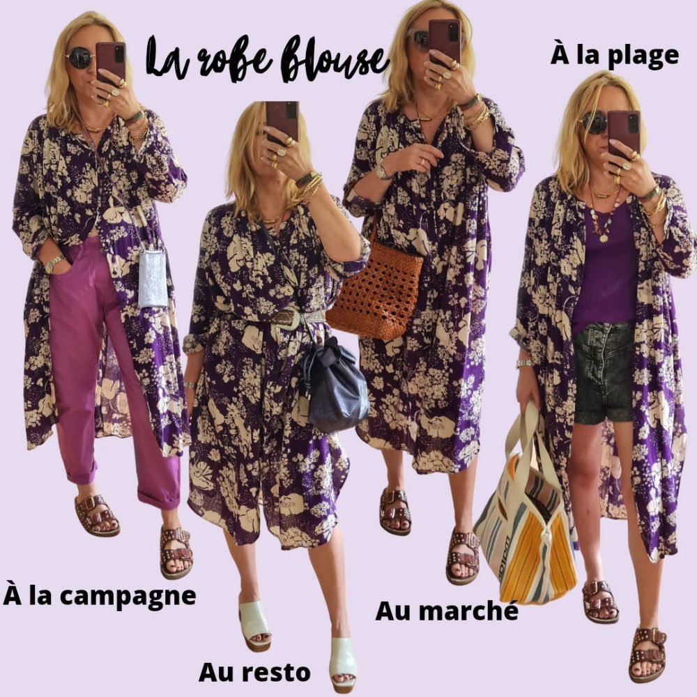 Maintenant voyons voir du côté de la robe blouse – qui est un peu comme une robe chemise mais sans col – ici en voile de coton qui est très agréable pour l’été (Laurence Bras ancienne co) – C’est génial parce qu’avec elle, on peut vraiment s’amuser – Fermée comme une liquette, elle est cool de chez cool – Ceinturée avec des sabots ou des espadrilles compensées (des chaussures qui prennent un peu de hauteur sans être trop habillées), elle passe partout – Très chouette à moitié ouverte sur un pantalon de la même palette chromatique – Elle prend l’aspect d’un kimono portée sur un short et un débardeur pour aller à la plage. Une robe = 4 possibilités