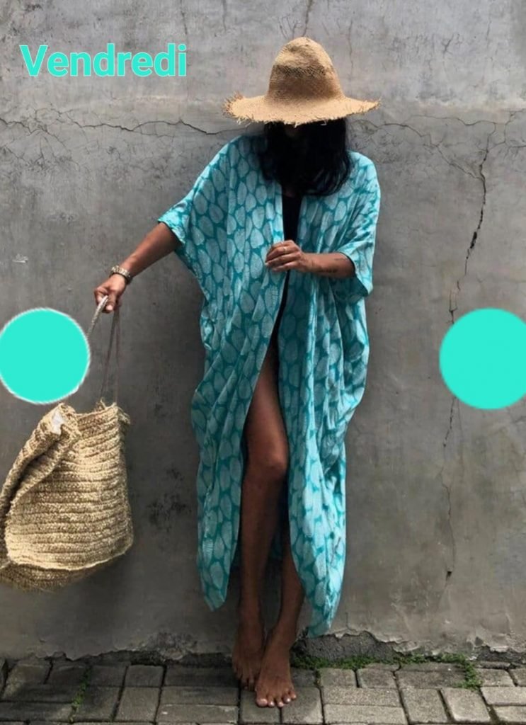 Le lundi, nous voilà débarquées sur notre lieu de vacances, blanches comme un lavabo pour certaines, ce n’est pas le moment d’attraper un coup de soleil (un coup d’amour, un coup de je t’aime) d’où le caftan… c’est la pièce qu’on ressort chaque année alors si vous n’en avez pas encore un, faites un petit tour au Monop où ils en ont toujours des très colorés et sympas. OK, il ne sera pas comme celui-ci mais ça fera quand même l’affaire.