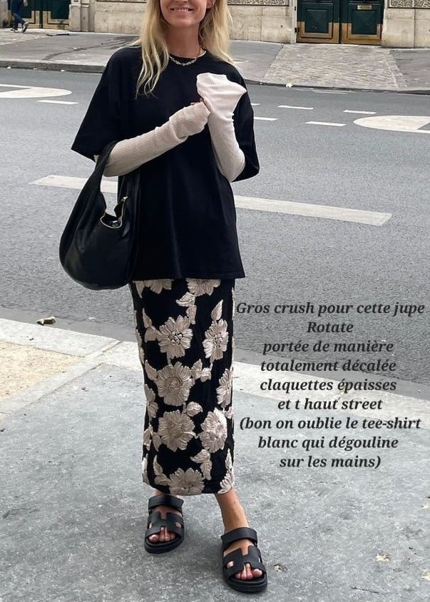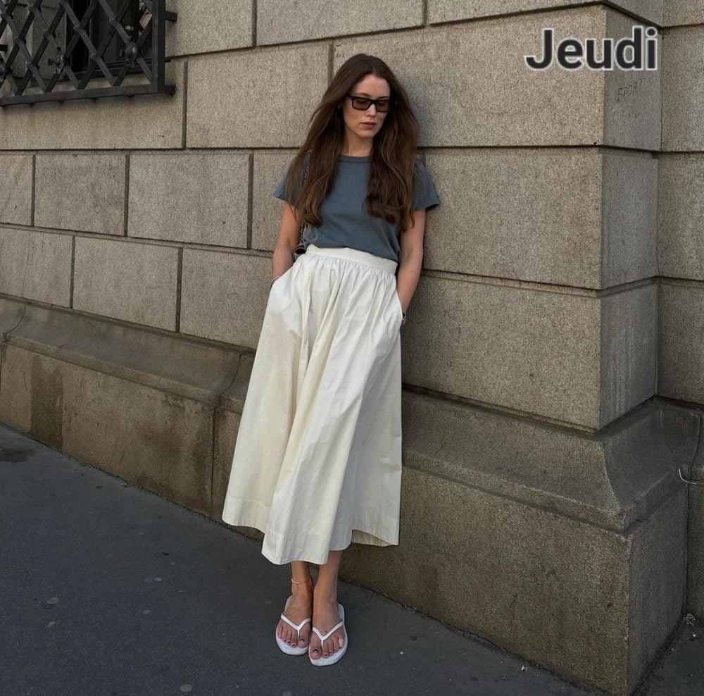 Et puis il y a les looks qui s’accomodent de tous les moods comme ici – Jupe corolle dans une matière qui a de la tenue (pour un look minimaliste c’est celle-ci qu’il faut privilégier), tee-shirt simple mais de bonne facture, tongs ou sandales en cuir préférablement (il n’y a que les tendanchieuses pour se balader en ville, sapées comme jamais mais avec des tongs en plastoc)