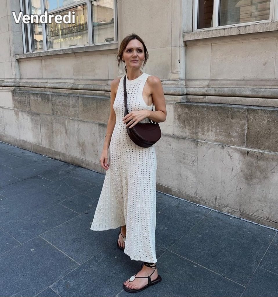 Encore ici une tenue qui passe de la ville à la vacances sans problème (j’assume la syntaxe) avec cette robe en crochet – peut-être un truc maison 123 ? Je plaisante… je n’ai que ça dans mon fil insta dernièrement – Le marketing fait des miracles c’est fou… Comment rendre un truc qui était ringard, acceptable ? En collaborant avec des centaines de petites influenceuses – OK après faudrait penser au design et à upgrader la came alors où comment mettre la charrue avant les bœufs. Pfff – Accessoires minimalistes pour compléter le tout.