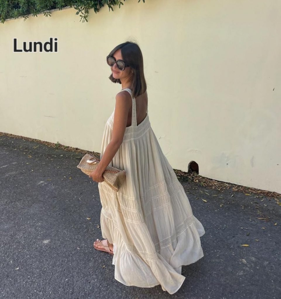 Lundi en robe de coton, longue et à bretelles, tongs et sac en raphia. Conseil : la surtailler pour plus de style.