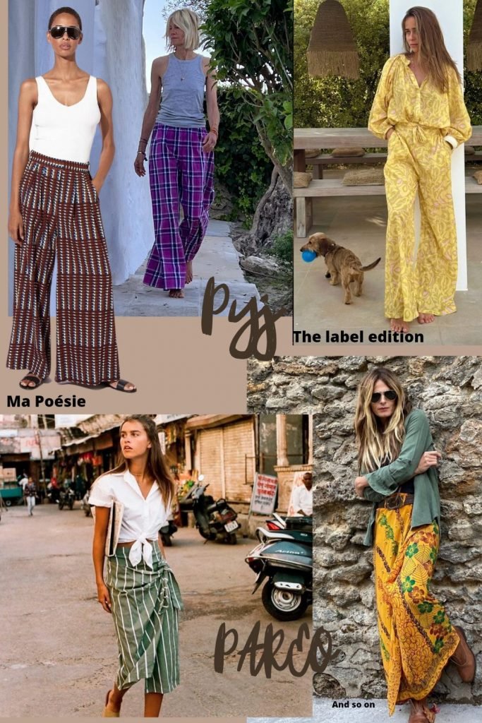 On ne se prend pas la tête, on sort en pyj ou tout du moins ce qui fait penser à un pyj – en ensemble, avec un tee-shirt sérigraphié ou un débardeur – ou en jupe paréo (qui parfois n’est qu’un simple carré de tissu) – le look de vacances par excellence.