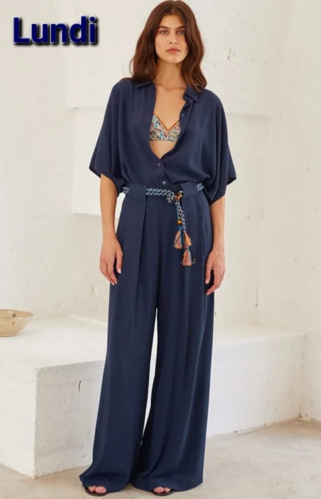 Lundi avec un ensemble mou, pantalon large + chemise (assortie ou non), une ceinture cordon pour le clin d’œil à l’été (+ cool qu’une fine ceinture en cuir), des sandales à peine visibles et des colliers grigris toujours pour l’esprit estival (inutile de montrer son soutif) – ici ensemble Momoni