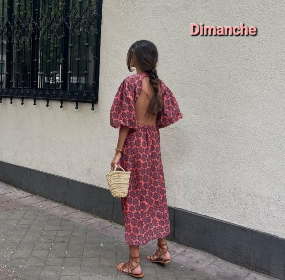 Dimanche, une robe très estivale avec un détail qui tue – comme ici les grosses manches ballons + le décolleté dans le dos – un panier, des spartiates – voilà l’été…