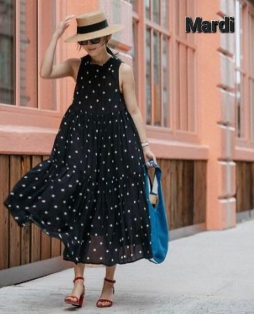 Au taf ou en vacances, une robe virevoltante, emmanchure américaine, imprimée ou non à porter avec des sandales à petits talons ou plates selon votre envie et un mignon chapeau de paille si vous êtes en vacances.