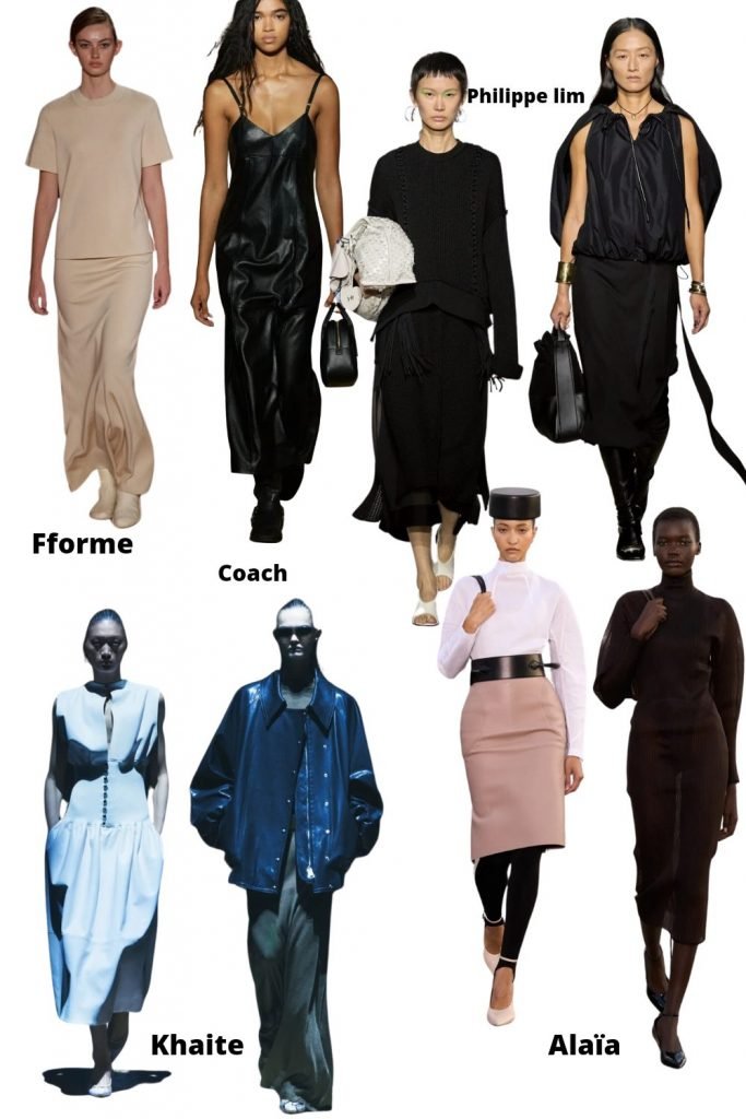 On garde la slip skirt, le look monochrome, la jupe tube. On s’inspire, des volumes de Philipp lim – jupe flou, sweater cool – de Khaite – taille corsetée ou teddy oversize sur robe longue. On peut s’essayer à la jupe crayon sur collant fuseau (ou pas), par contre pas d’hésitation concernant la silhouette impec, robe tube épaule ronde col cheminé chez Alaïa.