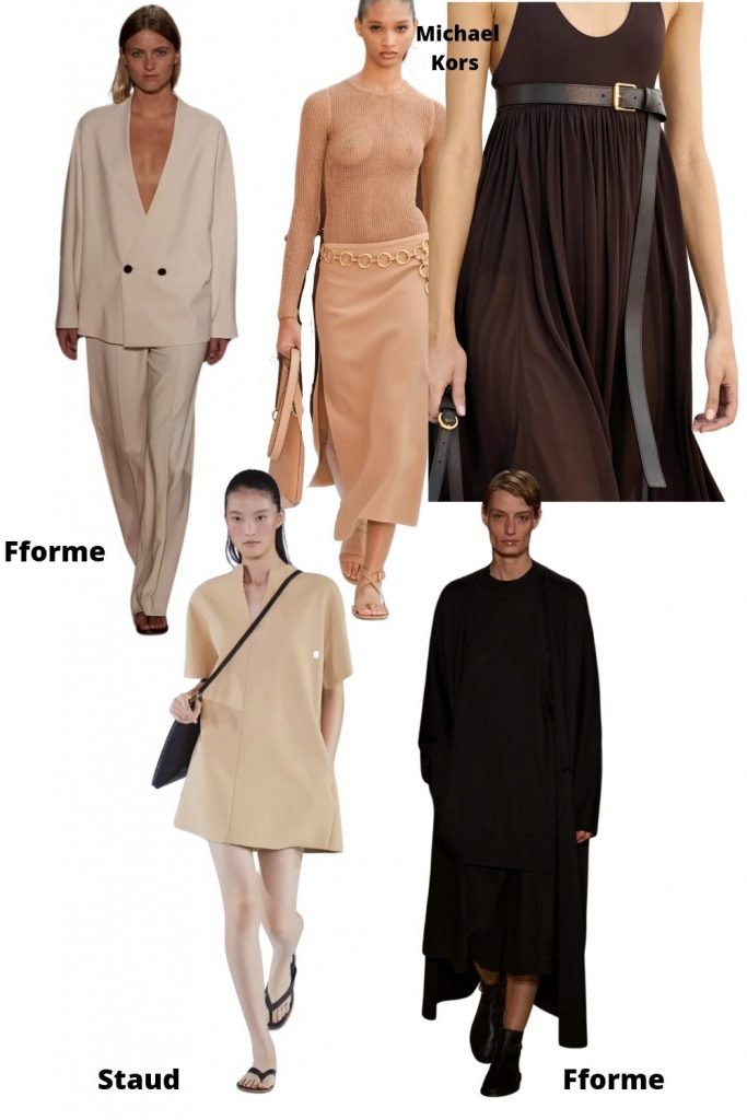 On garde chez Fforme la veste sans col (on avait déjà vu ça ici au printemps). Chez Michael Kors on garde la jupe droite 7/8 fendue des deux côtés, la ceinture sous les seins (si on n’en a pas ou peu …des seins pas des ceintures). Chez Staud la petite robe A rétro mais pas trop. Et encore chez Fforme on garde la longueur 10cm en dessous du genou + pardessus 7/8. La suite la semaine pro.