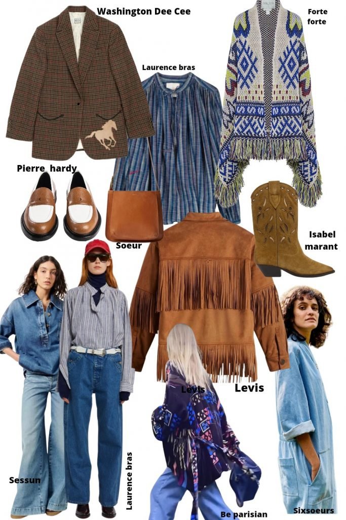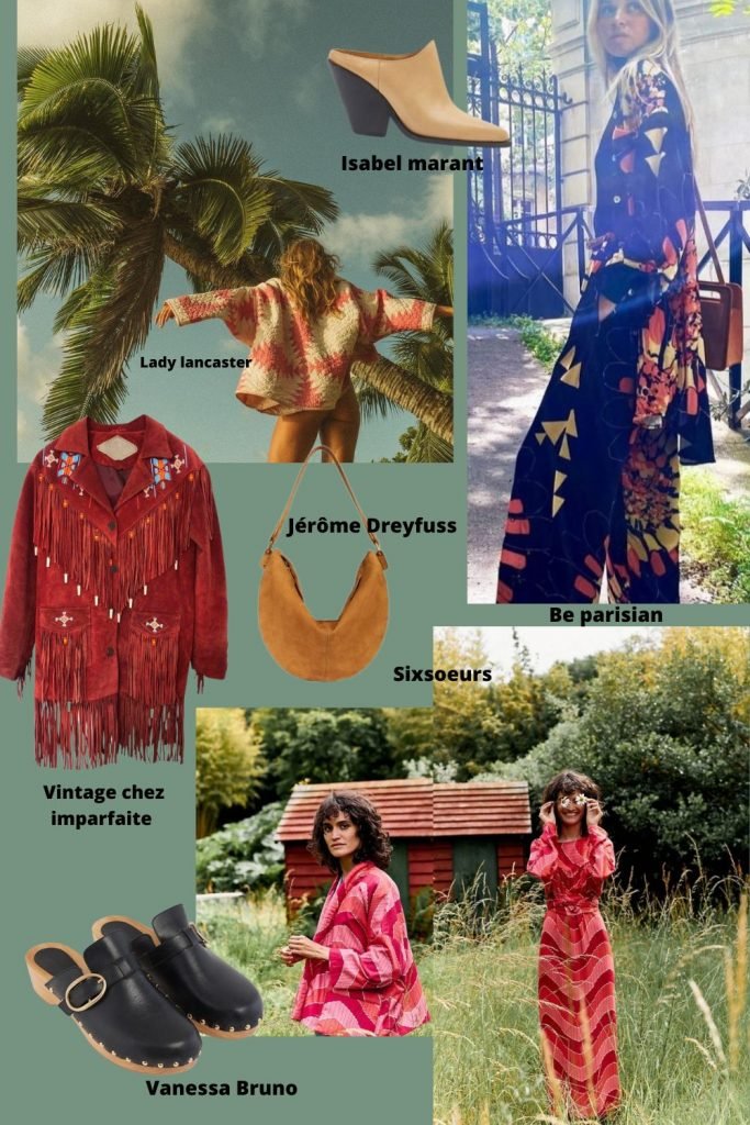 Ce style est né lors de la démocratisation des voyages et surtout des hippies des 70’s, qui mélangeaient pièces de la culture amérindienne / indienne / américaine. L’influence asiatique quant à elle, date de bien plus loin, un bon siècle avant. Il est donc hautement recommandé de chiner pour plus d’authenticité – veste à franges, kimono, vêtement de travail, surplus militaire, veste en tweed, veste brodée indienne, gilet Péruvien. Mais gare à ne pas se faire épingler pour appropriation culturelle hein ! pff
