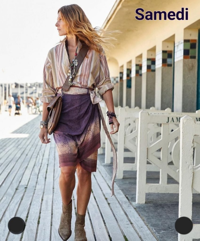 Samedi, un look qui nous met dans l’ambiance du focus de la semaine, totalement boho folk avec une jupe paréo mixée à une chemise / blouse rayée (les rayures sont toujours la bonne option pour les mix&match), des tiags courtes, des bijoux et une besace ethniques (le tout Hand so on).