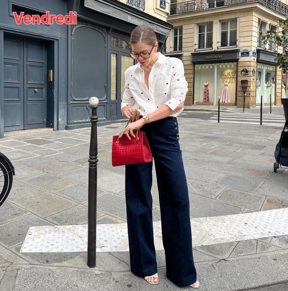 Vous vous souvenez, le vendredi c’est le jour du jean comme le lundi c’est ravioli… alors un jean coupe large ou comme ici un jean à ponts, ici en mode légèrement rétro avec une petite chemise brodée, des sandales à talons carrés et on récupère le sac rouge du mardi – bon maintenant c’est malin j’ai envie d’un sac rouge…