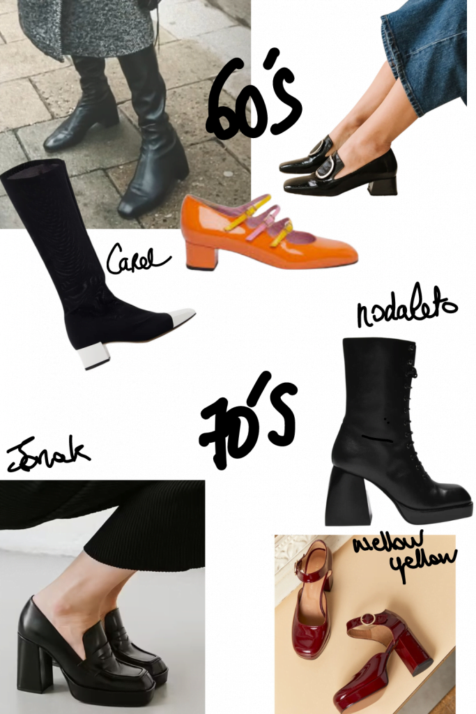 La mode n’en finit pas de se revisiter, cette année on retourne dans les années 60 grâce aux petits talons carrés propres à cette décennie où les filles n’en finissaient pas de raccourcir leur jupe et les 70’s où les plateformes étaient légion. À vous de choisir votre camp.