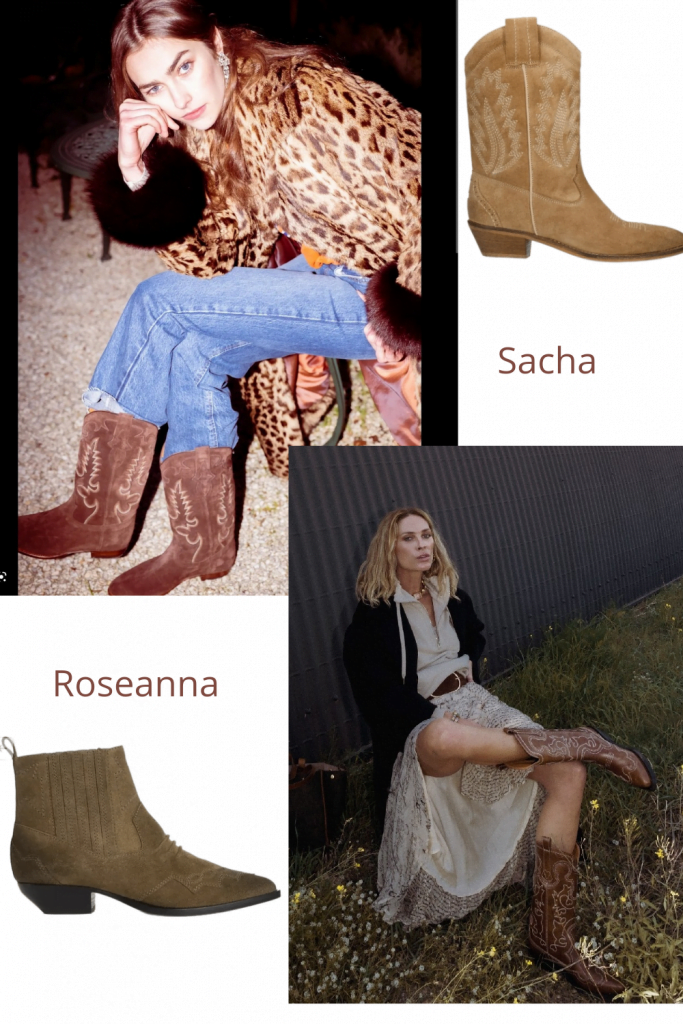 On a déjà abordé le sujet de la tiag dans le dossier « New folk » donc je ne reviendrai sur cette tendance précise, mais impossible de ne pas en reparler plus largement puisque c’est LE modèle qui s’est le plus démocratisé et surtout celui qui est le plus décliné, jusqu’à sortir totalement de son aura western pour arpenter l’asphalte. En daim, en cuir, claire ou foncée, courtes ou hautes, plates, talons biseautés ou pyramides, c’est un buffet à volonté.