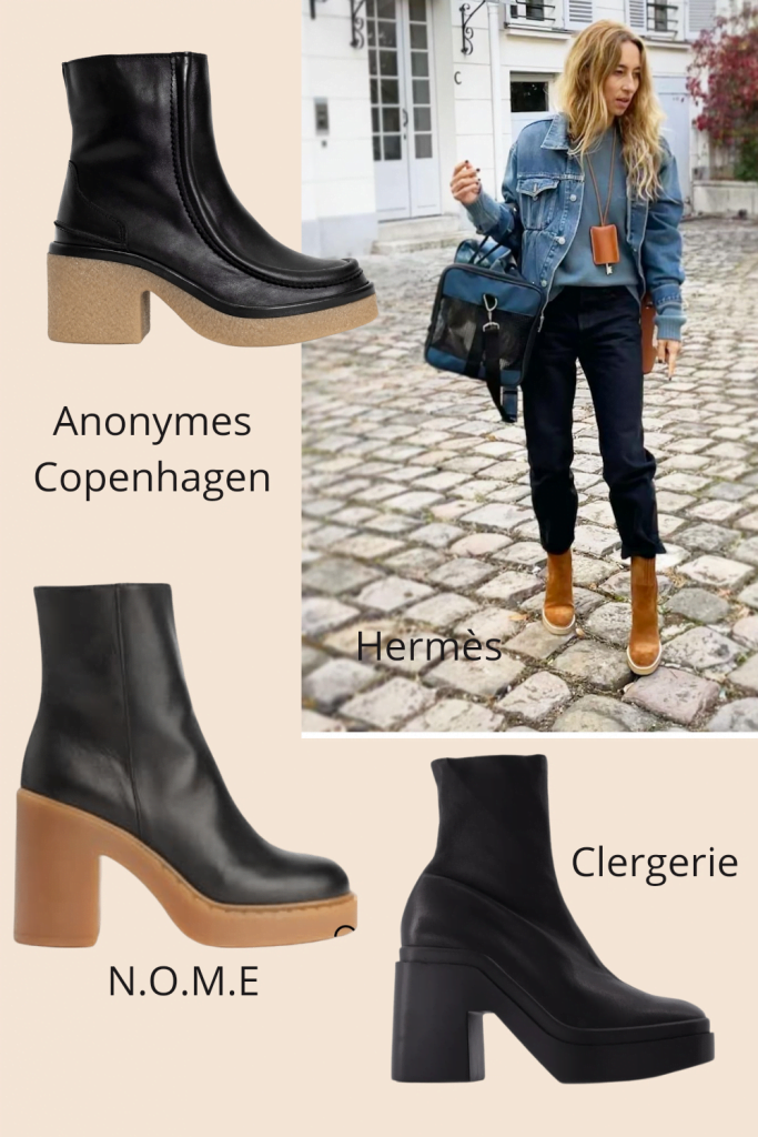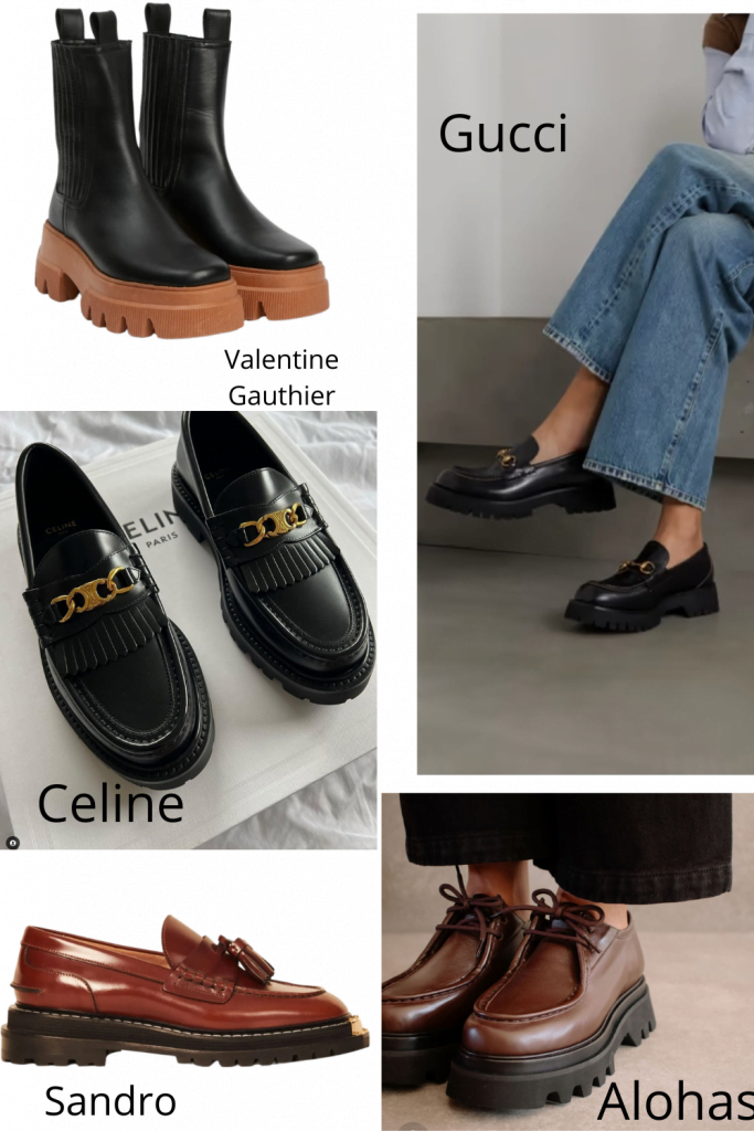 Les semelles de crêpes ou talon bloc comme la Clergerie (qui par ailleurs revient en force après 25 ans d’assoupissement) sont encore là cette saison. L’idéal pour garder les pieds au chaud l’hiver, braver les intempéries, faire office d’isolant en cas de coup de foudre 🙂 et pour donner un petit coup de booste à un look normcore.